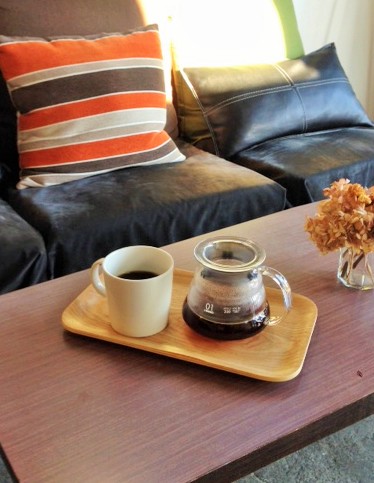 写真はイートインのドリップコーヒーLサイズです。サーバーに320ml抽出してマグカップと一緒にご提供いたします。カフェラテなどは12オンスのラテカップを、テイクアウトは大きいサイズのテイクアウトカップをご用意しております。