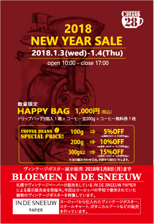 12月 26, 2017coffeestand28 年末年始営業のお知らせ 2017年も残りわずかとなりました。 当店の年末年始の営業についてお知らせいたします。 年内最終営業日 12月31日(日)10:00~17:00(L.O 16:30) 年始営業日 1月3日(水)10:00~17:00(L.O 16:30) 1月4日(木)10:00~17:00(L.O 16:30) 1月5日(金)定休日 ※1日、2日は休業いたします。 ※6日以降は通常営業 1月3日、4日は初売りでコーヒー豆セールをやります! 皆様、何卒よろしくお願い申し上げます! 共有: Facebook で共有 (新しいウィンドウで開きます) Facebook X で共有 (新しいウィンドウで開きます) X 関連