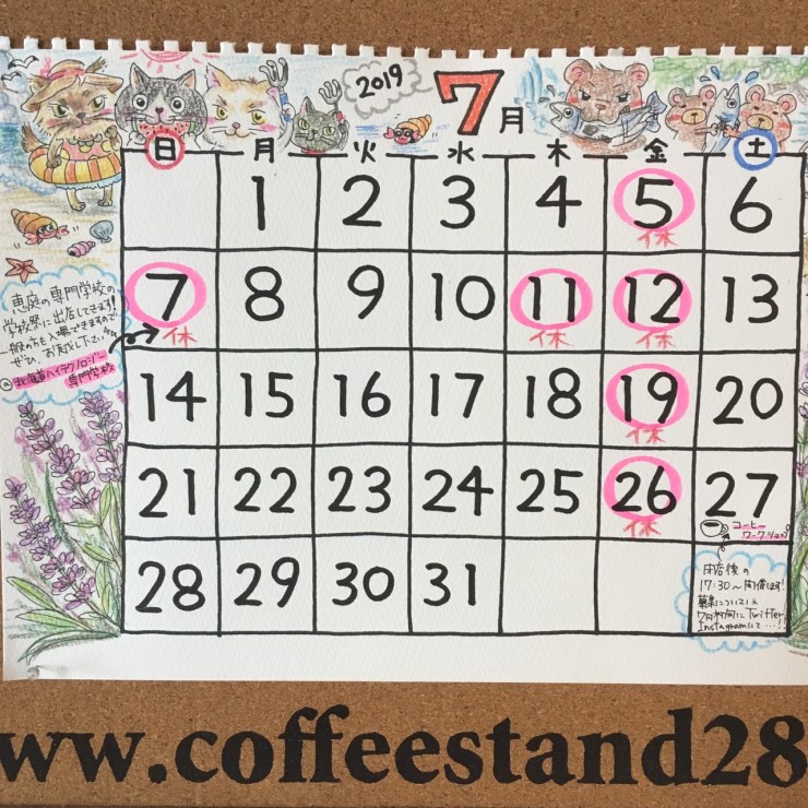7月 1, 2019coffeestand28 7月営業予定 7月11日(日)は北海道ハイテクノロジー専門学校さんの学校祭に出店するため、また、7月11日(木)は店舗整備のため臨時休業いたします。 7月もよろしくお願い申し上げます! 共有: Facebook で共有 (新しいウィンドウで開きます) Facebook X で共有 (新しいウィンドウで開きます) X いいね 読み込み中… 関連