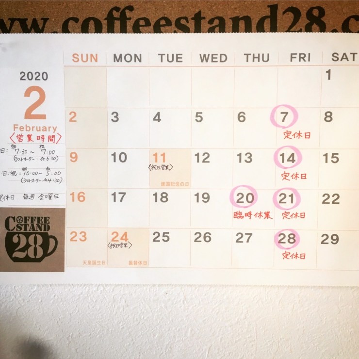 2月 6, 20202月 6, 2020coffeestand28 2月営業予定 遅くなりましたが2月の営業カレンダーです。 金曜日の定休日に加えて20日(木)が臨時休業となります。 よろしくお願い申し上げます。 共有: Facebook で共有 (新しいウィンドウで開きます) Facebook X で共有 (新しいウィンドウで開きます) X いいね 読み込み中… 関連