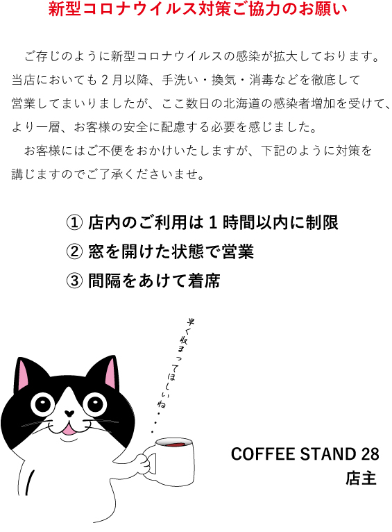 4月 10, 2020coffeestand28 新型コロナウイルス対策について 新型コロナウイルス感染拡大を受け、店内のご利用時間を制限するなどの対策を講じます。 お客様にはご不便をおかけいたしますが、ご了承くださいませ。 共有: Facebook で共有 (新しいウィンドウで開きます) Facebook X で共有 (新しいウィンドウで開きます) X いいね 読み込み中… 関連