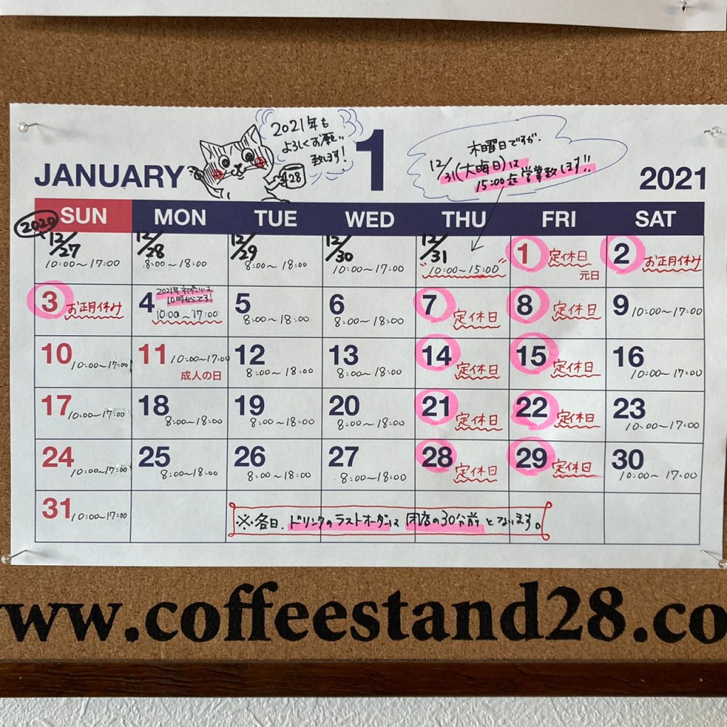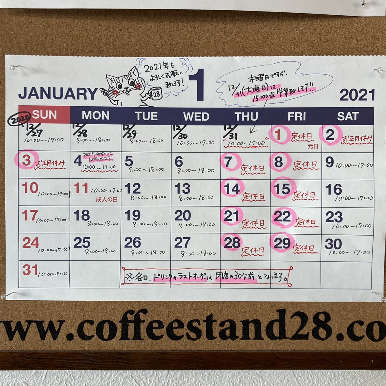 1月 6, 20211月 11, 2021coffeestand28 1月の営業予定 あけましておめでとうございます。 本年もCOFFEE STAND 28をよろしくお願い申し上げます。 共有: Facebook で共有 (新しいウィンドウで開きます) Facebook X で共有 (新しいウィンドウで開きます) X いいね 読み込み中… 関連