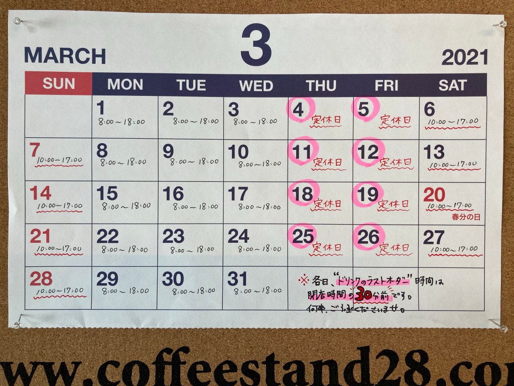 3月 1, 20213月 1, 2021coffeestand28 3月営業予定 雪溶けの進む季節になりますね。今月もよろしくお願い申し上げます。 共有: Facebook で共有 (新しいウィンドウで開きます) Facebook X で共有 (新しいウィンドウで開きます) X いいね 読み込み中… 関連