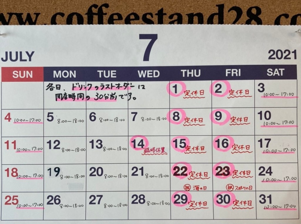 7月 5, 2021coffeestand28 7月の営業予定 7月の営業予定カレンダーです。 定休日に加えて、7月14日(水)は臨時休業いたします。何卒よろしくお願い申し上げます。 共有: Facebook で共有 (新しいウィンドウで開きます) Facebook X で共有 (新しいウィンドウで開きます) X いいね 読み込み中… 関連