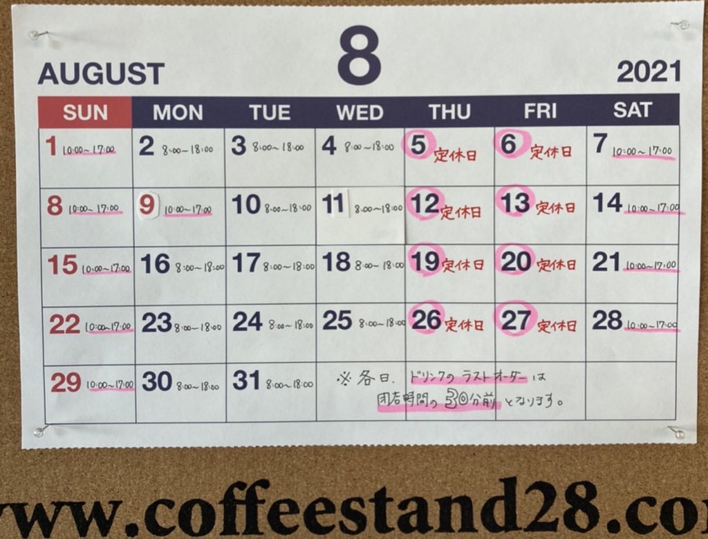 8月 1, 2021coffeestand28 8月の営業予定 暑い日が続いていますが、今月もよろしくお願い申し上げます。 共有: Facebook で共有 (新しいウィンドウで開きます) Facebook X で共有 (新しいウィンドウで開きます) X いいね 読み込み中… 関連