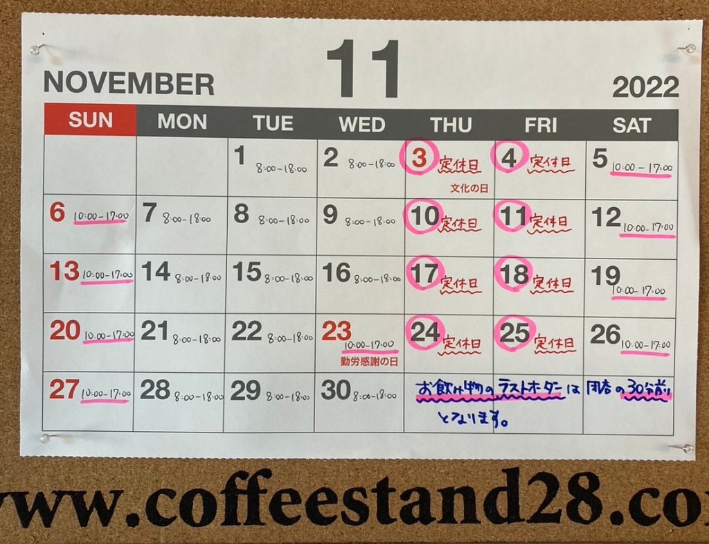 11月 1, 202211月 1, 2022coffeestand28 11月の営業予定 今年も残り2ヶ月となりました。今月もよろしくお願いいたします。 共有: Facebook で共有 (新しいウィンドウで開きます) Facebook X で共有 (新しいウィンドウで開きます) X いいね 読み込み中… 関連