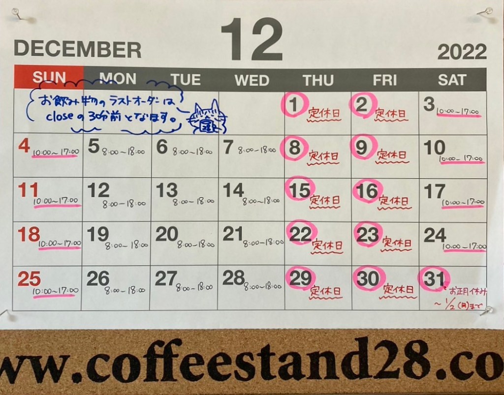 12月 3, 2022coffeestand28 12月の営業予定 今年も早いもので12月となりました。年内は28日まで、年始は3日から営業いたします。 共有: Facebook で共有 (新しいウィンドウで開きます) Facebook X で共有 (新しいウィンドウで開きます) X いいね 読み込み中… 関連