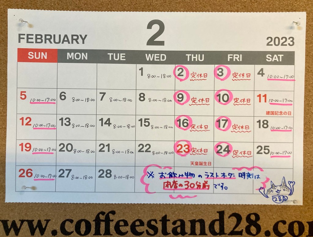2月 4, 2023coffeestand28 2月営業予定 今月8日(水)は地域の除雪作業が入る可能性があります。その際は時間帯により通行止めなどがありますので、何卒よろしくお願い申し上げます。 共有: Facebook で共有 (新しいウィンドウで開きます) Facebook X で共有 (新しいウィンドウで開きます) X いいね 読み込み中… 関連