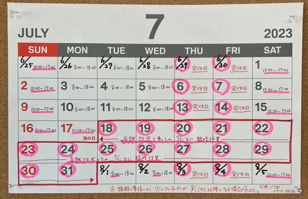 リニューアルオープンは8月1日を予定しておりますが、工事の進捗によって変更する場合がございますので、改めてご報告いたします。