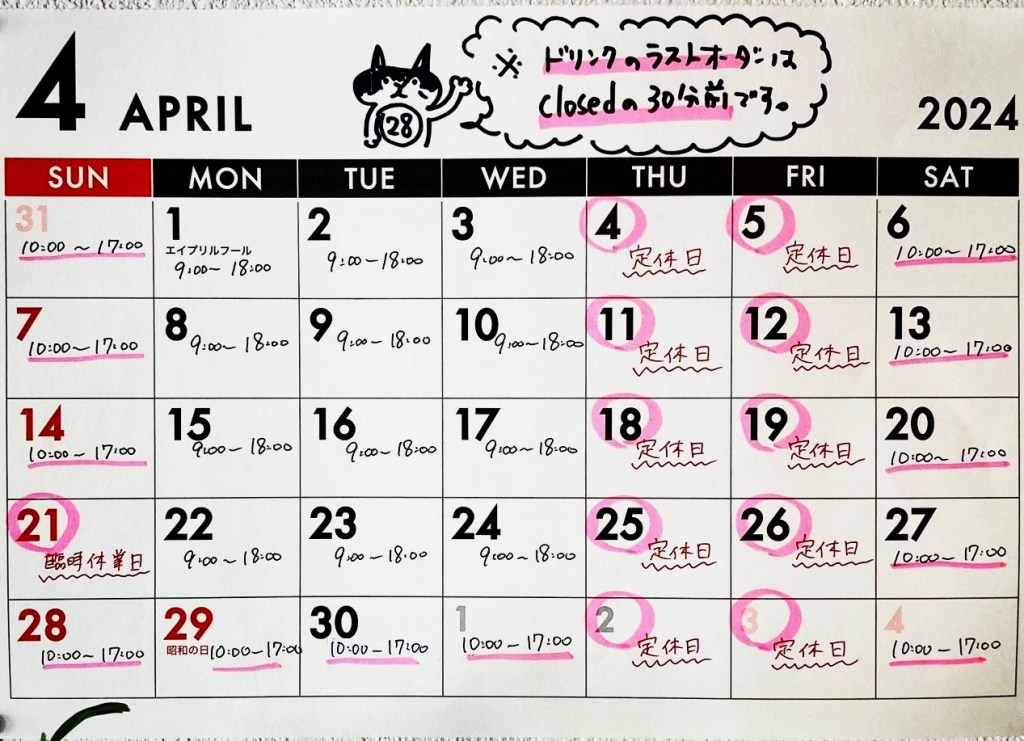 3月 31, 2024coffeestand28 4月の営業予定 雪解けが進んで店舗周辺の雪山もやっと姿を消し、冬場はご遠慮いただいていた店舗前の駐車も可能となりました。自転車用のサイクルラックも早めに再設置いたします。 ※4月21日(日)は勉強会参加のため臨時休業いたします。 共有: Facebook で共有 (新しいウィンドウで開きます) Facebook X で共有 (新しいウィンドウで開きます) X いいね 読み込み中… 関連