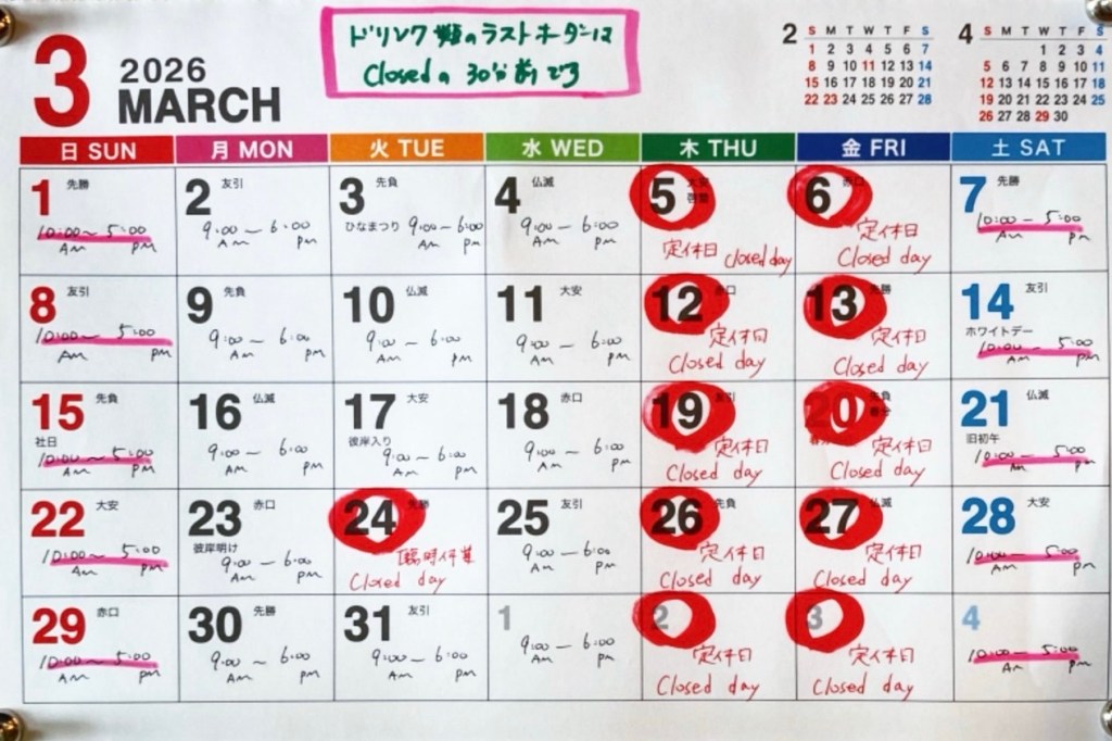 2月 28, 2026coffeestand28 3月の営業予定 少しずつ暖かくなってきました。今月から春らしいメニューが登場予定です。 3月24日は勉強会に参加するため臨時休業いたします。 今月もよろしくお願い申し上げます。 共有: Facebook で共有 (新しいウィンドウで開きます) Facebook X で共有 (新しいウィンドウで開きます) X いいね 読み込み中… 関連